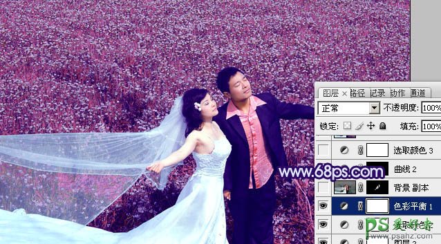 PS调色教程:给花草地上的情侣婚片调出绚丽的蓝紫色