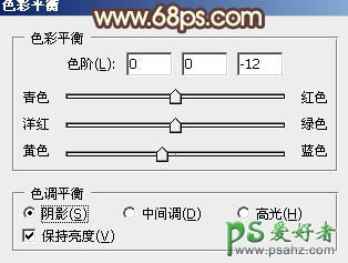 8、创建色彩平衡调整图层,对阴影进行调整,参数设置如图19,效果如图20。这一步增加图片暗部褐色。