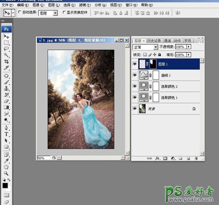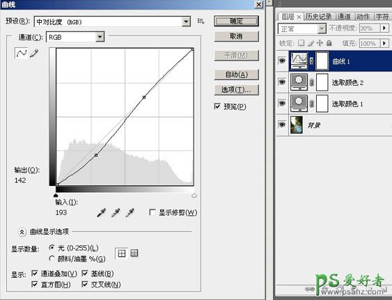 2、使用“曲线”工具,稍微增加一点对比,我用的是软件预设的“中对比度”,然后降低该曲线图层的透明度到合适的数值。