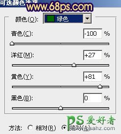 1、打开原图素材,创建可选颜色调整图层,对绿色进行调整,参数设置如图1,效果如图2。这一步把背景绿色转为黄绿色。