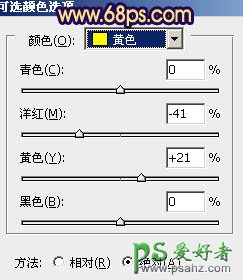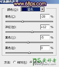 4、创建创建可选颜色调整图层,对黄、蓝进行调整,参数设置如图11,12,确定后把图层不透明度改为: 50%,效果如图13。这一步微调黄色和蓝色。