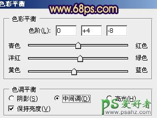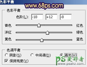 6、调出当前蒙版选区,创建色彩平衡调整图层,对中间调,高光进行调整,参数设置如图15,16,效果如图17。这一步微调肤色颜色。
