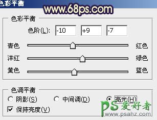 2、创建色彩平衡调整图层,对高光进行调整,参数设置如图6,确定后把蒙版填充黑色,用白色画笔把人物部分擦出来,再把图层不透明度改为:50%,效果如图7。这一步微调人物部分颜色。