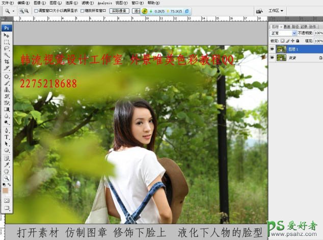 1、打开素材,复制图层,用仿制图章修饰一下脸上,液化下人物的脸型。