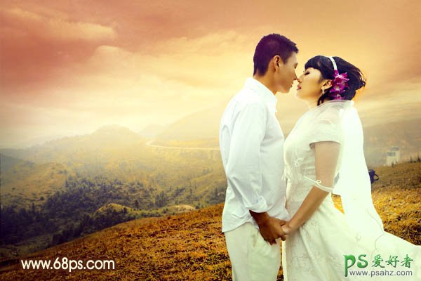 PS调色教程:给一对接吻中的情侣婚片调出落日霞光色
