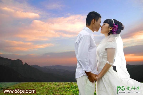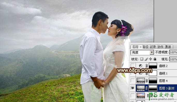 3、把天空素材复制一层,原天空图层隐藏。把天空部分图层按Ctrl + Shift + U 去色。混合模式改为“亮度”,添加图层蒙版,用黑白线性渐变拉出底部透明度效果。是天空与背景结合,效果如下图。