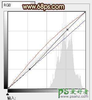 6、创建曲线调整图层,对RGB、红、蓝进行调整,参数设置如图7,确定后只保留天空部分,其它部分用黑色画笔擦掉,效果如图8。这一步增加天空暖色。