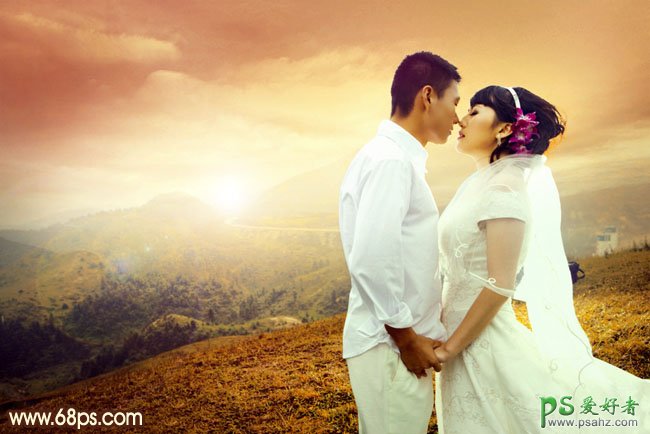 今天我们来和大家学习一篇PS婚片调色实例教程,PS调色教程:给一对接吻中的情侣婚片调出落日霞光色,素材图片取景非常大气和开阔,不过缺少了天空和霞光的照射,少了很多灵气。处理的时候需先给图片的天空部分增加云彩,然后再慢慢渲染霞光色即可。