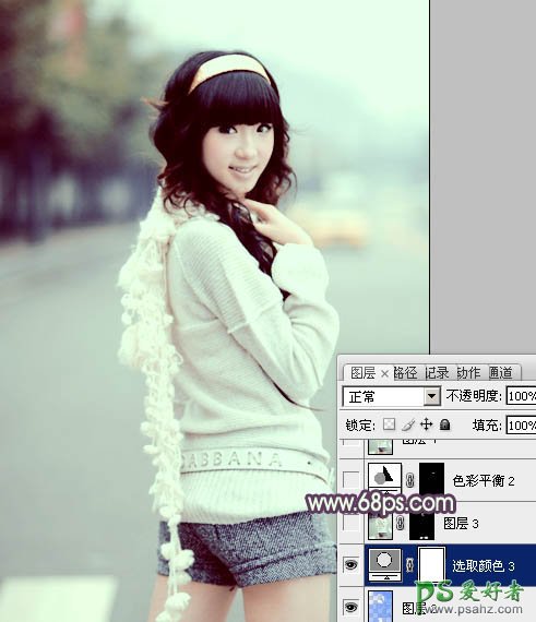 PS给公路上的超短裙美腿少女图片调出淡绿韩系色