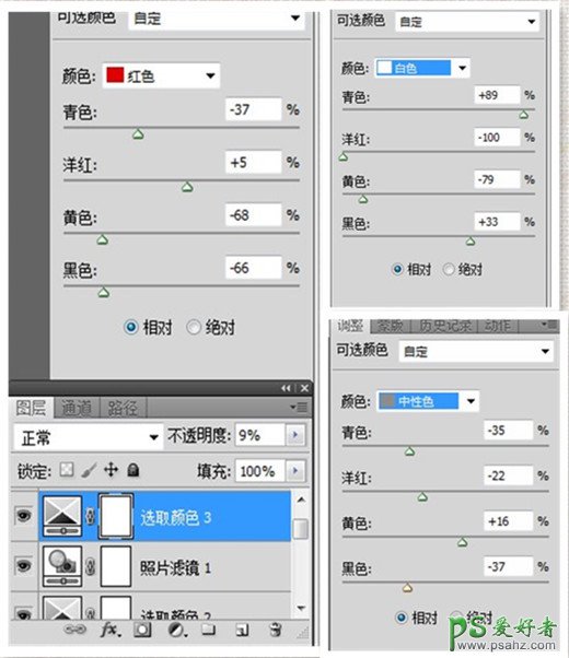 11、新建调整层——可选颜色,图层不透明度9%,数值如下:红色:-37/5/-68/-66;白色:89/-100/-79/33;中性色:-35/-22/16/-37。