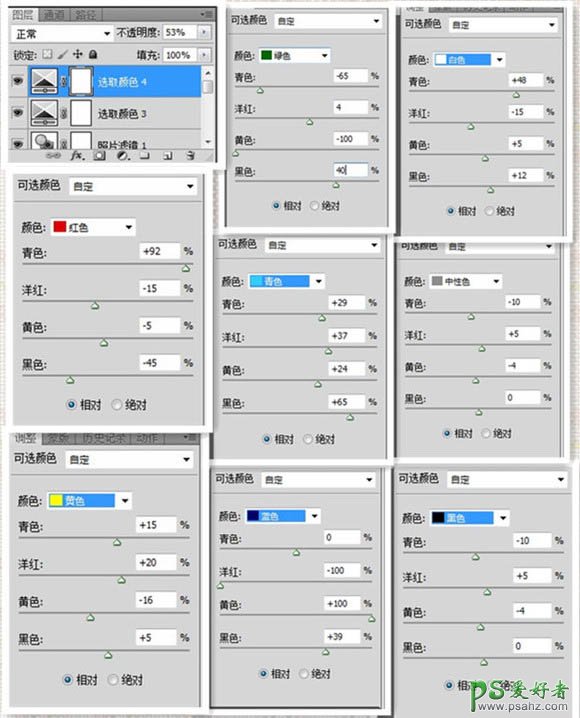 12、再次创建调整层——可选颜色,图层不透明度53%,数值如下: 红色:92/-15/-5/-45;黄色:15/20/-16/5;绿色:-65/4/-100/40;青色:29/37/24/65;蓝色:0/-100/100 /39;白色:48/-15/5/12;中性色:-10/5/-4/0;黑色:-10/5/-4/0。