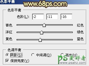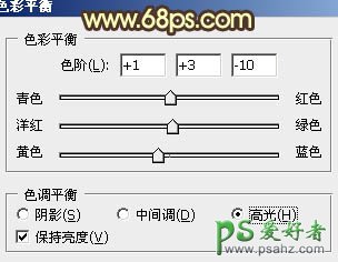 7、创建色彩平衡调整图层,对阴影,高光进行调整,参数设置如图12,13,效果如图14。这一步增加图片暖色。