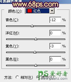 5、创建可选颜色调整图层,对红,黄进行调整,参数设置如图11,12,效果如图13。这一步增加图片的暖色。