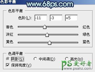 6、创建色彩平衡调整图层,对阴影,高光进行调整,参数设置如图11,12,效果如图13。这一步增加暗部的褐色。