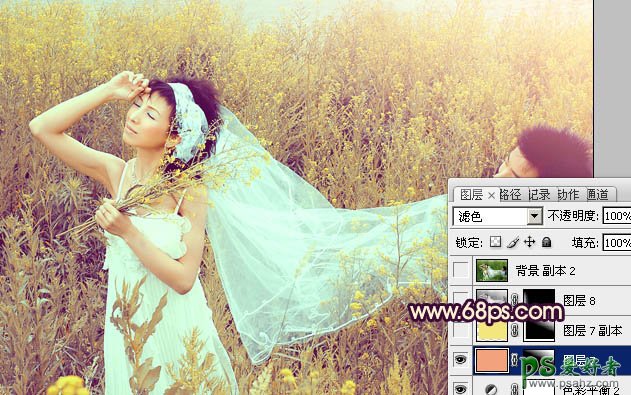 photoshop调出浪漫金色效果油菜花地里的爱侣婚纱照