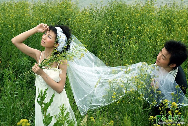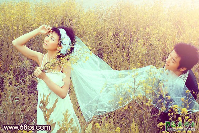今天我们来学习一篇PS婚片调色实例教程,photoshop调出浪漫金色效果油菜花地里的爱侣婚纱照,金色调比较适合背景部分色调较多的图片。处理的过程也比较简单:先用调色工具逐一把各种颜色都转为暖色,然后再给暗部及高光部分增加一些补色即可。高光及暗部可按自己的喜好调整。