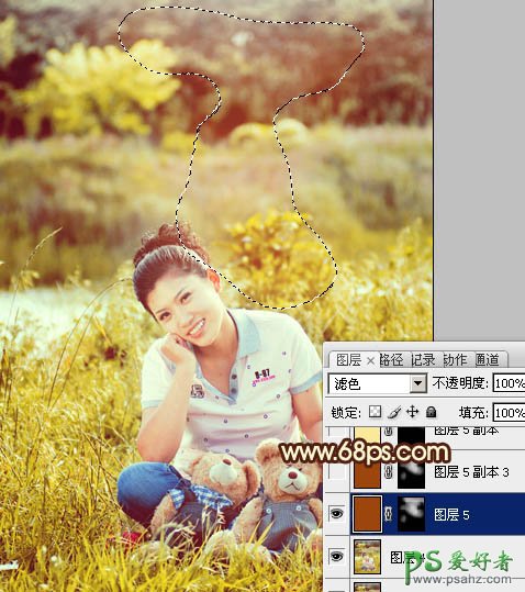 9、新建一个图层,填充暗红色:#9C460D,混合模式改为“滤色”,按住Alt键添加图层蒙版,用白色画笔把下图选区部分涂出来,增加背景部分的红褐色。