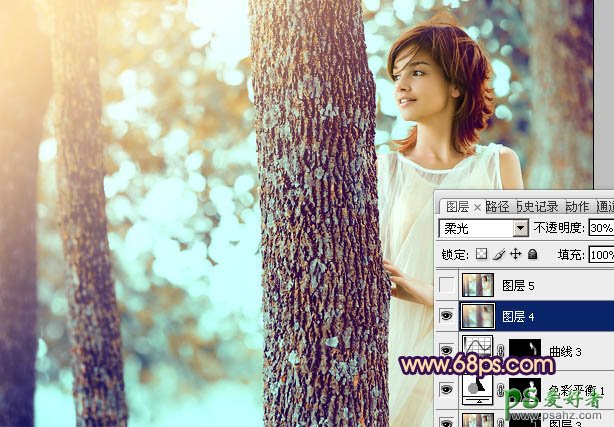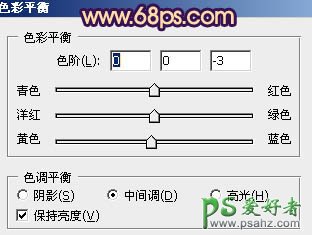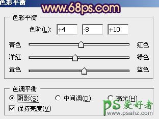 16、创建色彩平衡调整图层,对阴影、中间调、高光进行调整,参数设置如图31 - 33,效果如图34。这一步微调整体颜色。