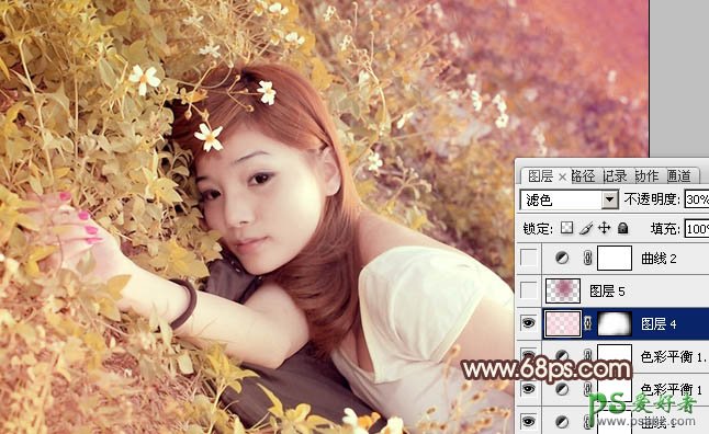 9、按Ctrl + Alt + 2 调出高光选区,新建一个图层填充淡紫色:#FBD4DB,混合模式改为“滤色”,不透明度改为:30%。按住Alt键添加图层蒙版,用白色画笔把人物及周围部分擦出来,效果如下图。