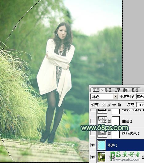 1、打开原图素材,新建一个图层,填充淡青色:#99F9F7,混合模式改为“滤色”,不透明度改为:50%,添加图层蒙版,用黑色画笔把边角部分擦出来,效果如下图。