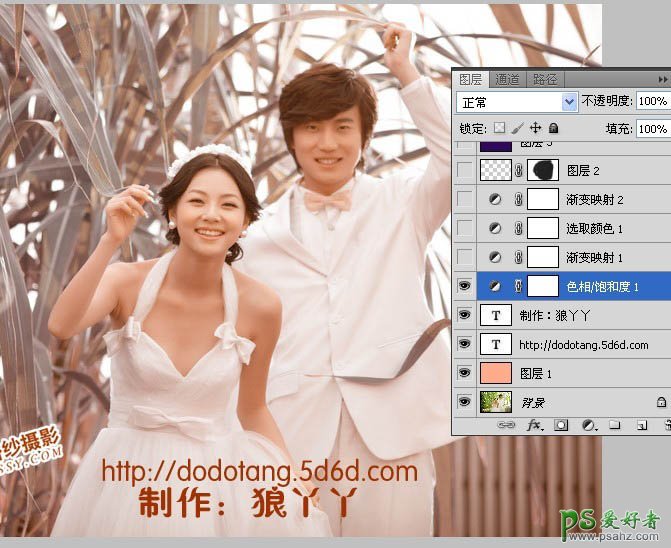 PS调色教程:给树林中的情侣婚片增加柔美的黄紫色