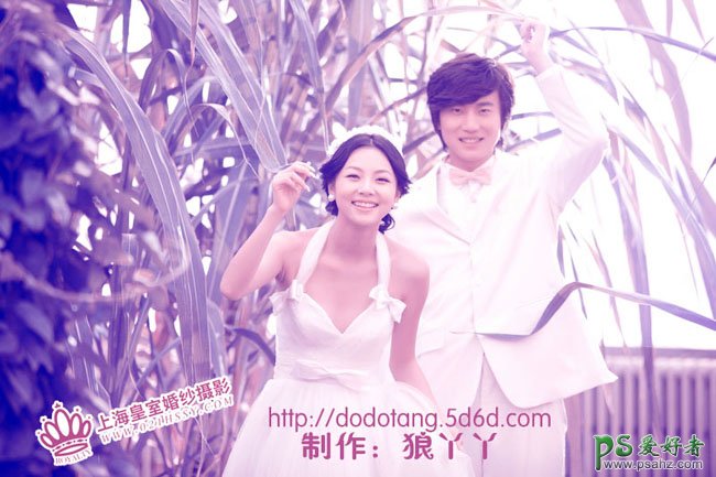 今天我们来和大家共同学习一篇PS婚片调色实例教程,情侣婚纱艺术照调色,photoshop快速调出浪漫的蓝紫色庄嫁地里的情侣婚片,紫色是非常浪漫的颜色,调色方法有很多。最常用的就是用通道替换法做出双色图片,然后再转为紫色。本教程介绍一种比较实用的方法,直接用色相/饱和度调整,用吸管吸取主色后可快速调出想要的颜色。