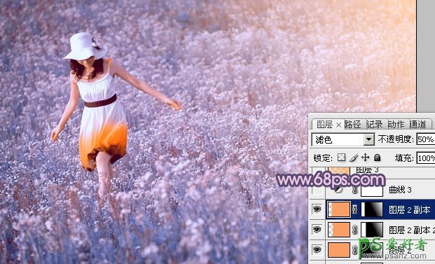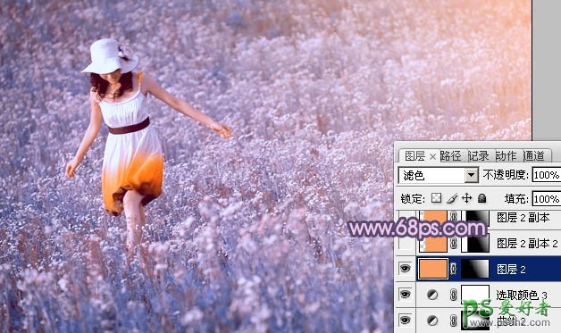 8、新建一个图层,填充橙红色:#F89F66,混合模式改为“滤色”,按住Alt键添加图层蒙版,用白色画笔把右上角部分擦出来,效果如下图。这一步增加图片的高光。