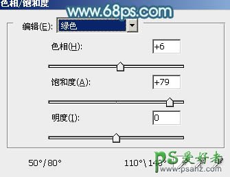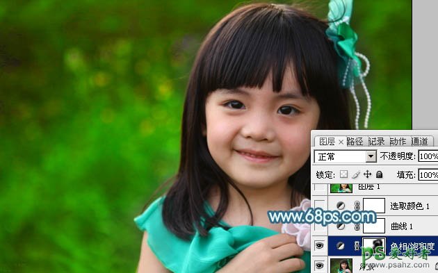 1、打开原图素材,创建色相/饱和度调整图层,选择绿色,用吸管吸取背景绿色再调整,参数设置如图1,确定后用黑色画笔把人物部分擦出来,效果如图2。这一步提亮背景绿色。