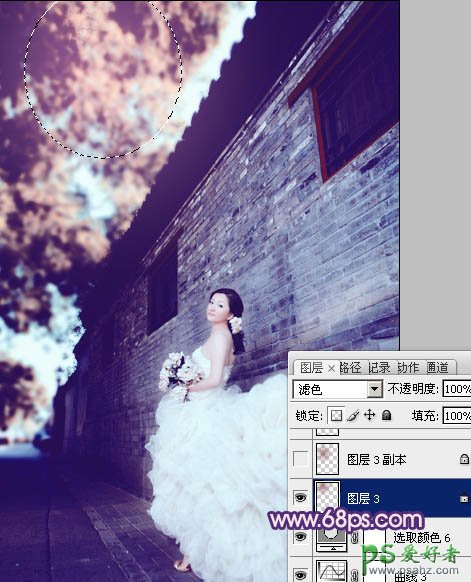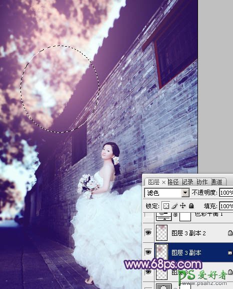 9、新建一个图层,混合模式改为“滤色”,用椭圆选框工具拉出下图所示的选区,羽化60个像素后填充暗红色:#99636B,效果如图24。确定后再复制几份,调整好位置,效果如图25。这一步增强图片的高光。