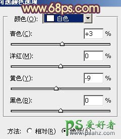 12、创建可选颜色调整图层,对白色进行调整,参数设置如图33,确定后把蒙版填充黑色,用白色画笔把人物脸部擦出来,适当降低图层不透明度,效果如图34。