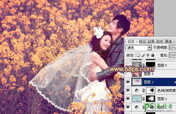 9、新建一个图层,用椭圆选框工具拉出下图所示的椭圆选区,羽化50个像素后填充暗紫色:#984696,混合模式改为“滤色”,不透明度改为:30%,效果如下图。