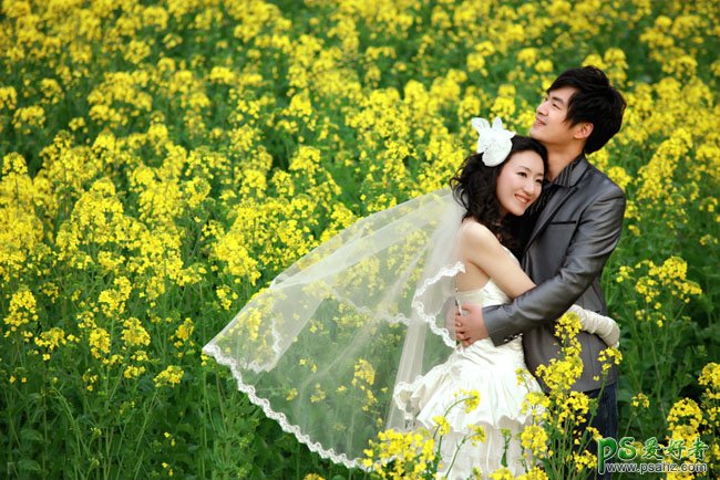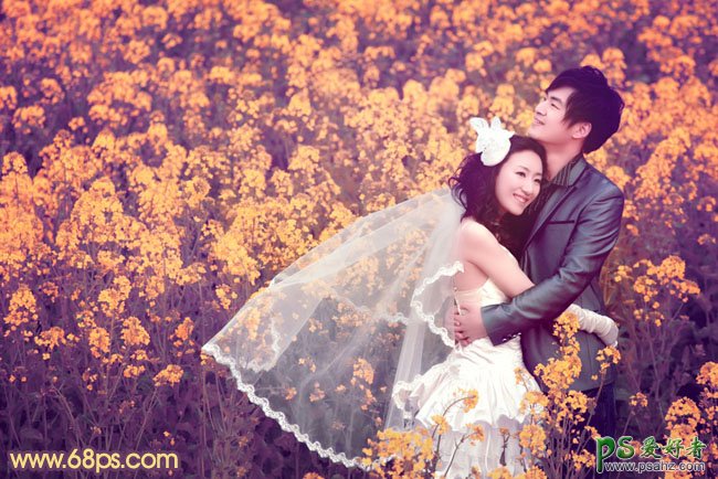 PS婚片后期调色教程,photoshop给一对甜蜜蜜的情侣婚片调出漂亮的橙紫色,本教程介绍暖色婚片的调色方法。大致过程:先从背景颜色调起,可以用通道替换或调色工具把背景主色转为暖色,然后微调人物部分的颜色,大致融合后微调一下整体颜色及高光颜色即可。