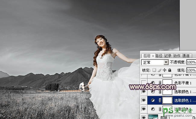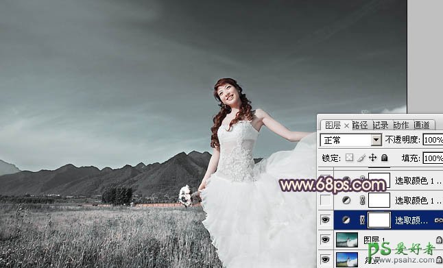 PS调色教程:给蓝天白云下的荒原少女婚片调出古典紫褐色