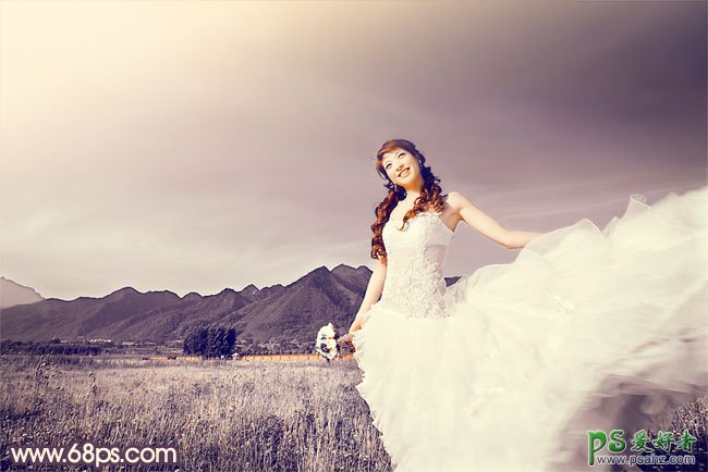 今天我们来学习一篇PS婚片后期调色教程,PS调色教程:给蓝天白云下的荒原少女婚片调出古典紫褐色,本教程介绍较为古典的外景图片调色方法。大致过程:先用通道替换减少图片的颜色,然后把主色调为较为统一的紫褐色,再在高光部分增加一些淡黄色即可。