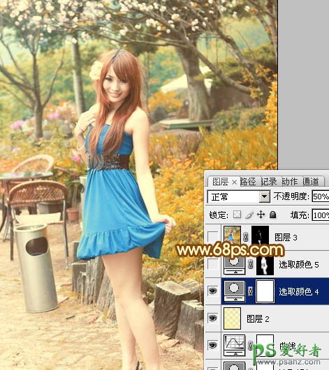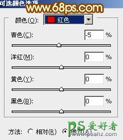9、创建可选颜色调整图层,对红、黄进行调整,参数设置如图29 ,30,确定后把蒙版填充黑色,用白色画笔把人物部分擦出来,再适当降低图层不透明度,效果如图31。这一步微调人物部分的颜色。