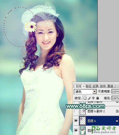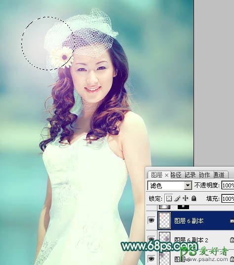 14、新建一个图层,用椭圆选框工具拉一个稍小的椭圆选区,羽化30个像素后填充淡粉色:#FBCFC0,混合模式改为“滤色”,效果如下图。