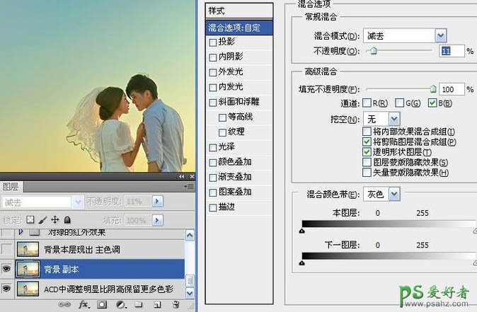 3、图层通道调色,去掉面板中某些通道前面的勾,结合混合模式及不透明度使PS调图空间豁然广大,上黄色,二层决定。