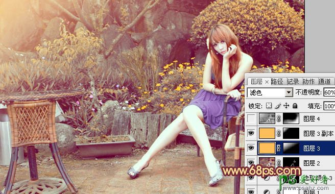 8、新建一个图层,填充橙黄色:#FEBF5B,混合模式改为“滤色”,按住Alt键添加图层蒙版,用白色画笔把左上角部分擦出来,不透明度改为:60%,效果如下图。这一步增加图片的高光。如果不够明显,可以把当前图层再复制一层。