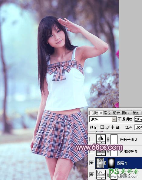 8、新建一个图层,按Ctrl + Alt + Shift + E 盖印图层。再按Ctrl + Shift + U 去色,混合模式改为“滤色”,不透明度改为:20%。按住Alt键添加图层蒙版,用白色画笔把人物部分擦出来,效果如下图。这一步增加人物部分的亮度。