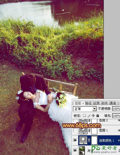 PS调色教程:给乡村水塘边的情侣婚片调出温馨的霞光色