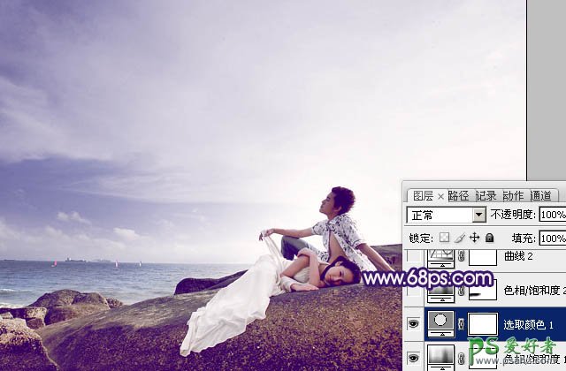 PS婚片调色实例教程,photoshop调制出经典蓝紫色海景情侣婚片教程,本教程介绍蓝色海景婚片调色方法。大致过程:先简单修复图片的一些偏色及瑕疵。然后用色相/饱和度或可选颜色快速调出主色,后期美化细节,再渲染高光及暗部颜色即可。 最终效果