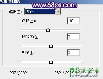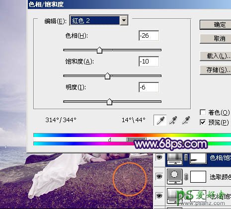4、创建色相/饱和度调整图层,选择红色,用吸管吸取图13红圈位置颜色再调整。确定后选择蓝色,用吸管吸取天空颜色调整,参数设置如图14,效果如图15。这一步把红色转为蓝紫色。