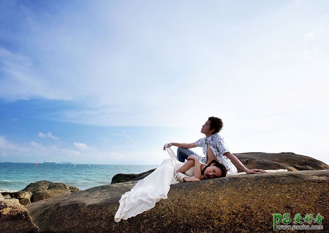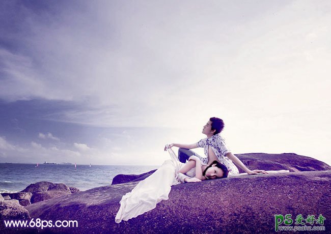 PS婚片调色实例教程,photoshop调制出经典蓝紫色海景情侣婚片教程,本教程介绍蓝色海景婚片调色方法。大致过程:先简单修复图片的一些偏色及瑕疵。然后用色相/饱和度或可选颜色快速调出主色,后期美化细节,再渲染高光及暗部颜色即可。
