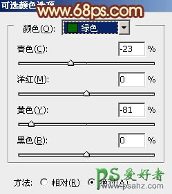 2、创建可选颜色调整图层,对黄、绿、黑进行调整,参数设置如图2 - 4,效果如图5。这一步把背景绿色转为橙黄色,并增加暗部红色。