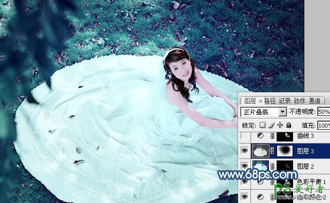 11、新建一个图层,按Ctrl + Alt + Shift + E 盖印图层。按Ctrl + Shift + U 去色,混合模式改为“正片叠底”,不透明度改为:50%。添加图层蒙版,用黑色画笔把中间部分擦出来,效果如下图。