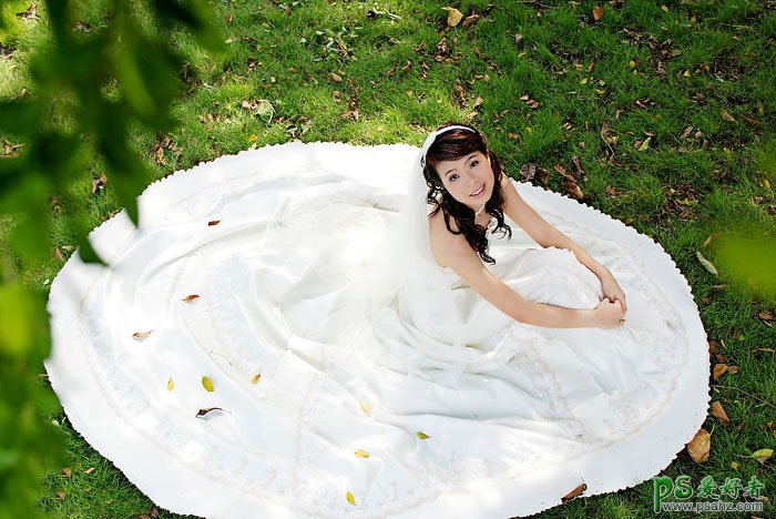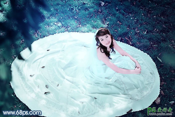 PS婚片后期调色教程,PS调色教程:给美女婚片调出个性流行的青蓝色,青蓝色是较为常用的颜色,不过调色的时候人物部分很容易也变成青蓝色,可能不太好看。处理的时候最好把人物及背景分开调色,这样颜色比较好控制一点。