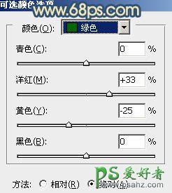3、再创建可选颜色调整图层,对黄,绿参数设置如图7,8,效果如图9。这一步把绿色转为青色。