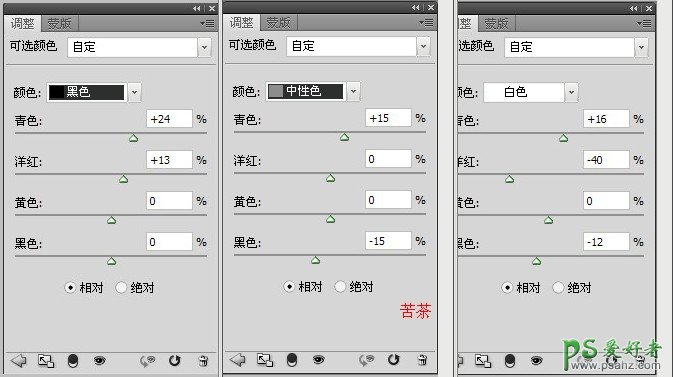 3、创建可选颜色调整图层,选择白色、中性色、黑色,这一步是调整全图的色彩,参数及效果如下图。