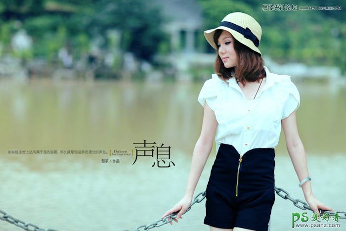 PS美女照片调色实例教程,PS调色教程:快速给河边时尚少女写真照调出唯美的青色调,素材图片拍摄时的天气不是很好,整体有点浑浊。处理的时候可以适当调亮图片,给水面及背景增加合适的颜色。这样图片看上去会清爽很多。