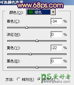 3、再创建可选颜色调整图层,对黄、绿、青进行调整,参数设置如图7 - 9,效果如图10。这一步增加背景黄色亮度,同时微调天空颜色。